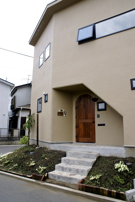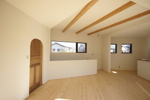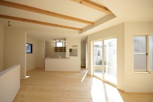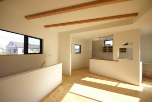 パイン無垢のフローリングと調湿効果の高い珪藻土の仕上げで柔らかい雰囲気です。つたい歩きの赤ちゃんと一緒の打ち合わせ、住んでから家具をつくり足したり、子供部屋に床下収納を設けたり、何となく自分も家族の一員になったような、、うれしい限りです。変形の角地に建つお住まいです。角地のせいか面積以上に広く感じるリビング。南は隣家と接していますが朝から夕方まで日が入るようプランを工夫しました。北に高窓を取り風が抜けるように、1階の高窓は防犯上も有効だったようです。