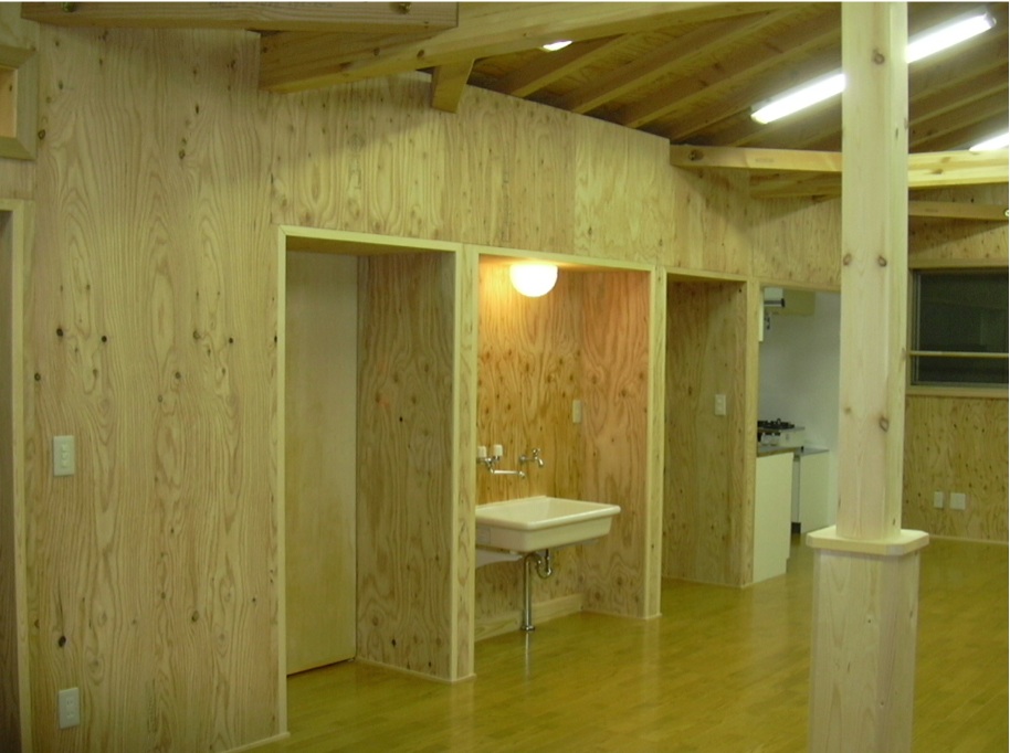 小学校の放課後を過ごす学童保育所です。コストを抑える目的もあり木造に。元気な子供たちがぶつかっても大丈夫な合板の壁です。