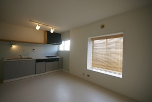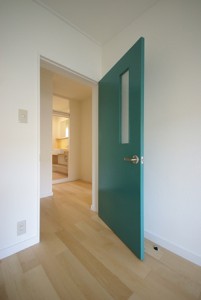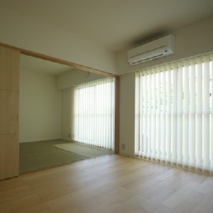 近くに大きな公園のある高台の集合住宅。周辺も緑に囲まれた静かな環境です。 まだ充分に使えるシステムキッチンであったため、まわりのカラースキームを合わせて新しい空間になじむよう生かしています。 (PHOTO Tomoko Tashiro)