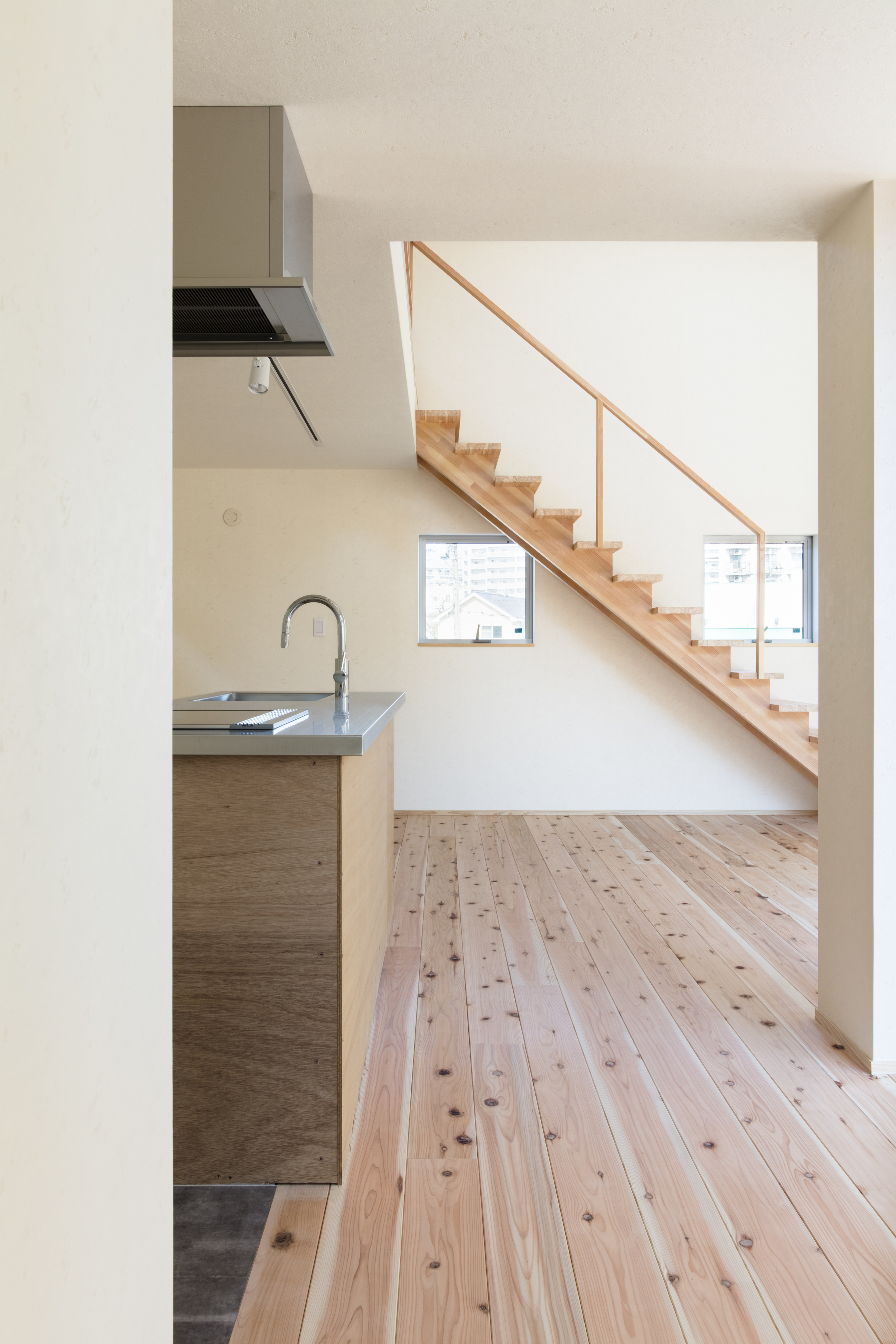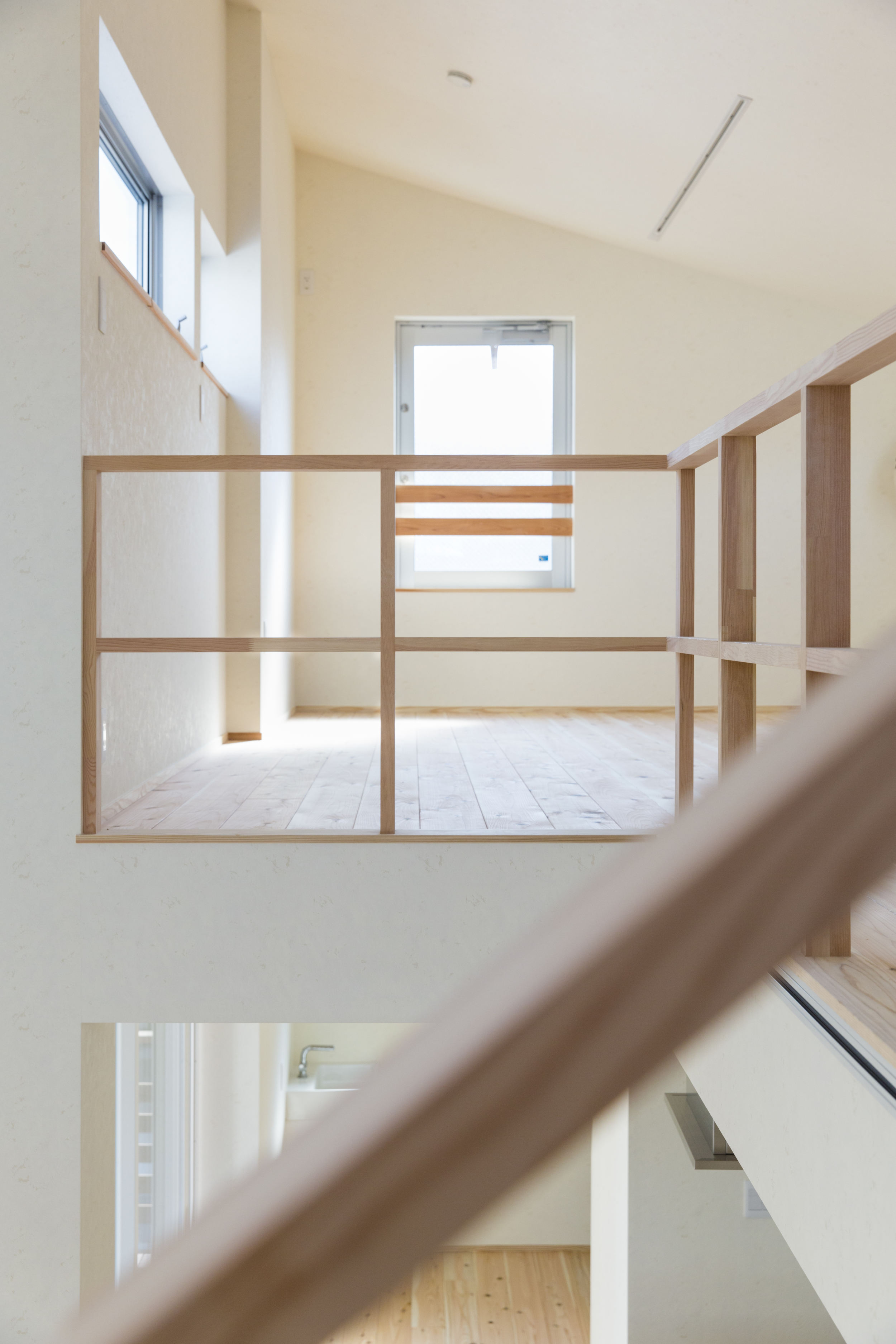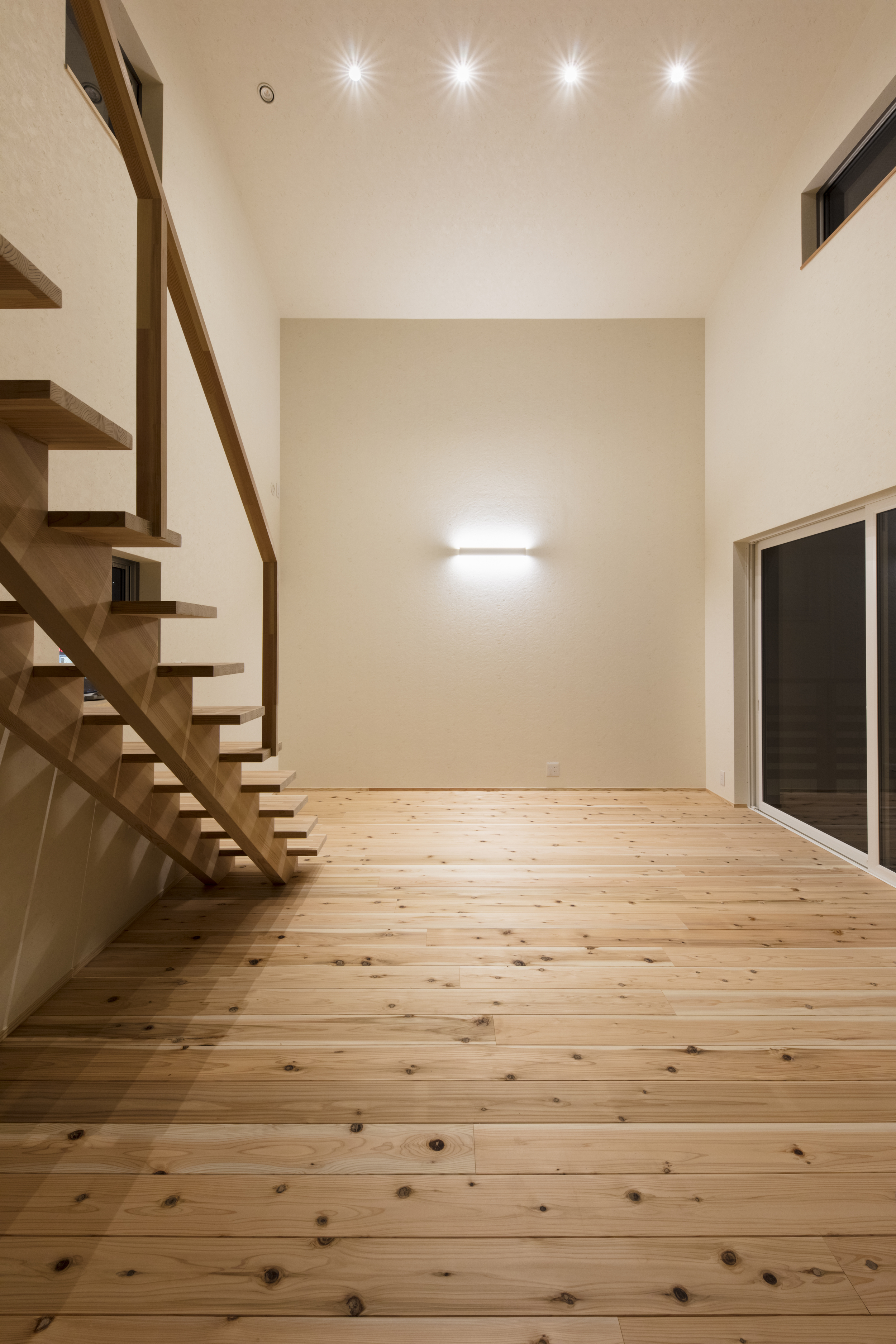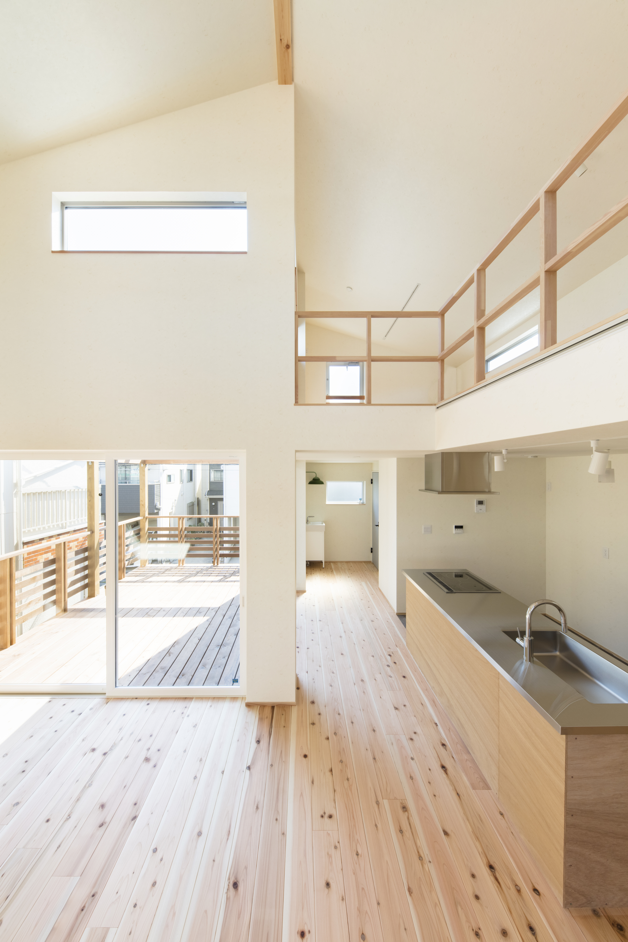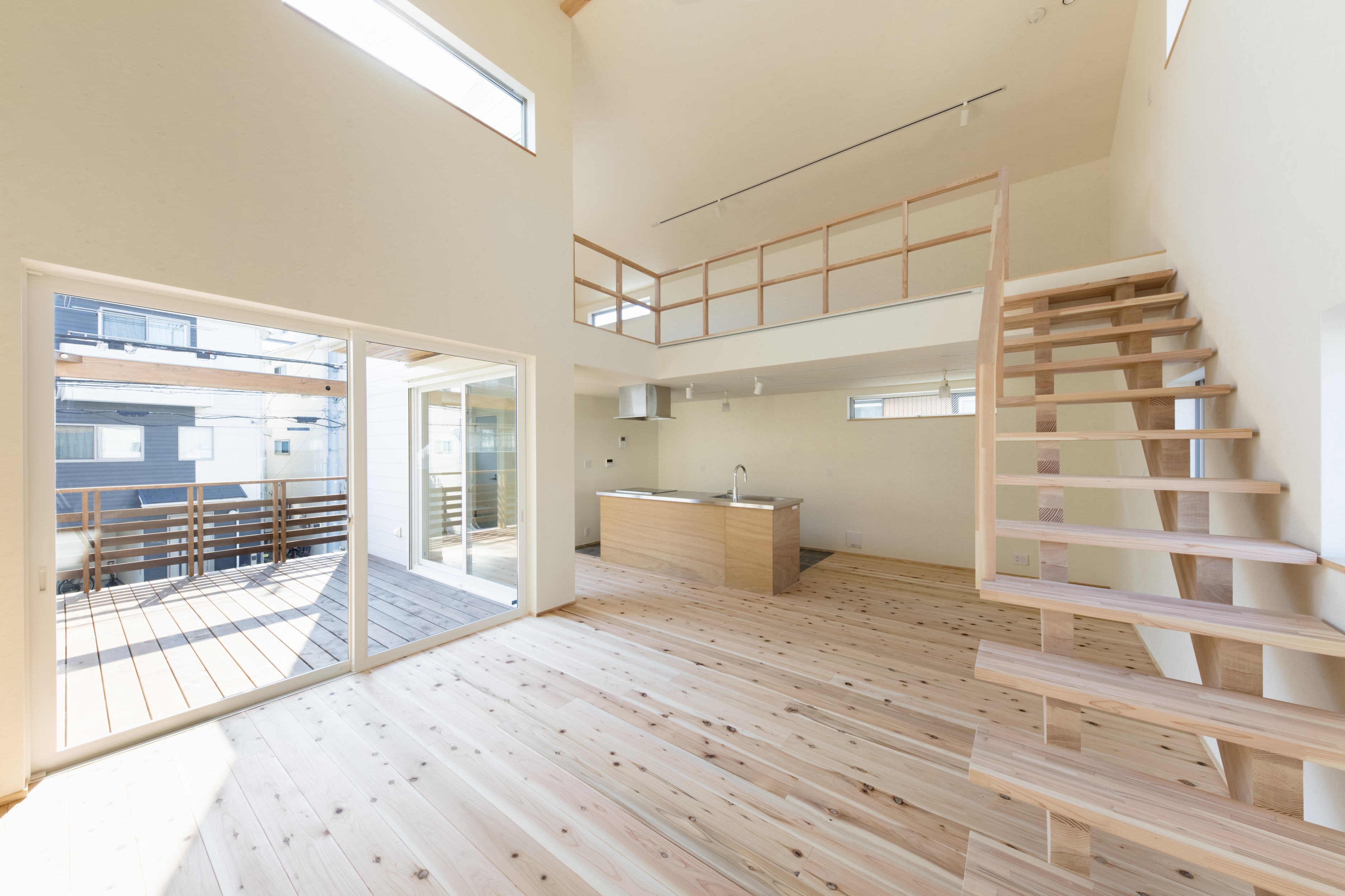2階にある大きなバルコニーテラスとリビングダイニング。リビングから3階フリースペースへオープン階段でつながっていきます。 階段も家具の一つ、座って話をしたりするシーンも想像ができます。大きな左右対称の切妻屋根が特徴の室内空間は伸び伸び明るい印象 です。全般に杉の無垢床ではだしで歩いても気持ちが良く、色々なファブリックが映えそうです。 (PHOTO 澤崎信孝)
