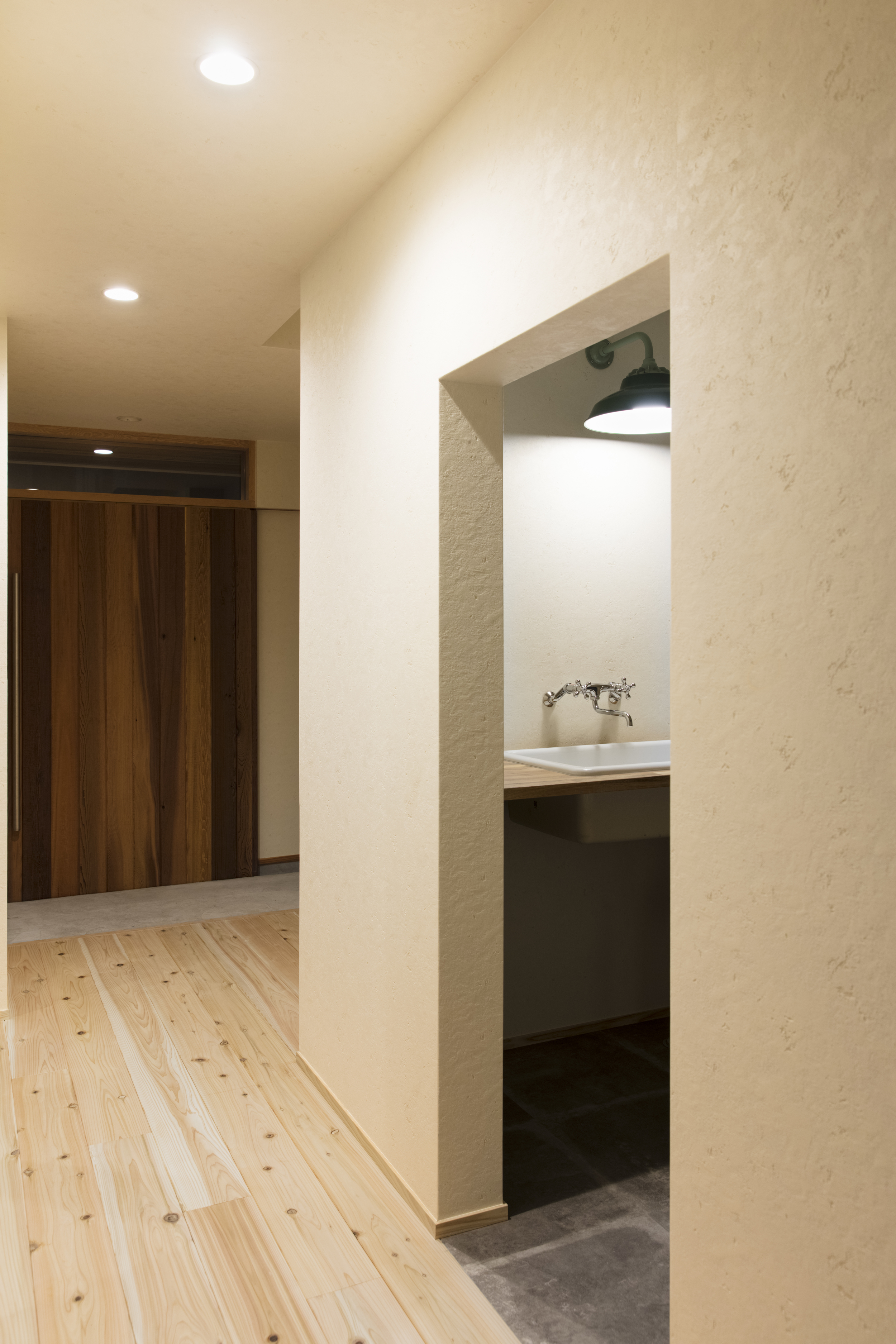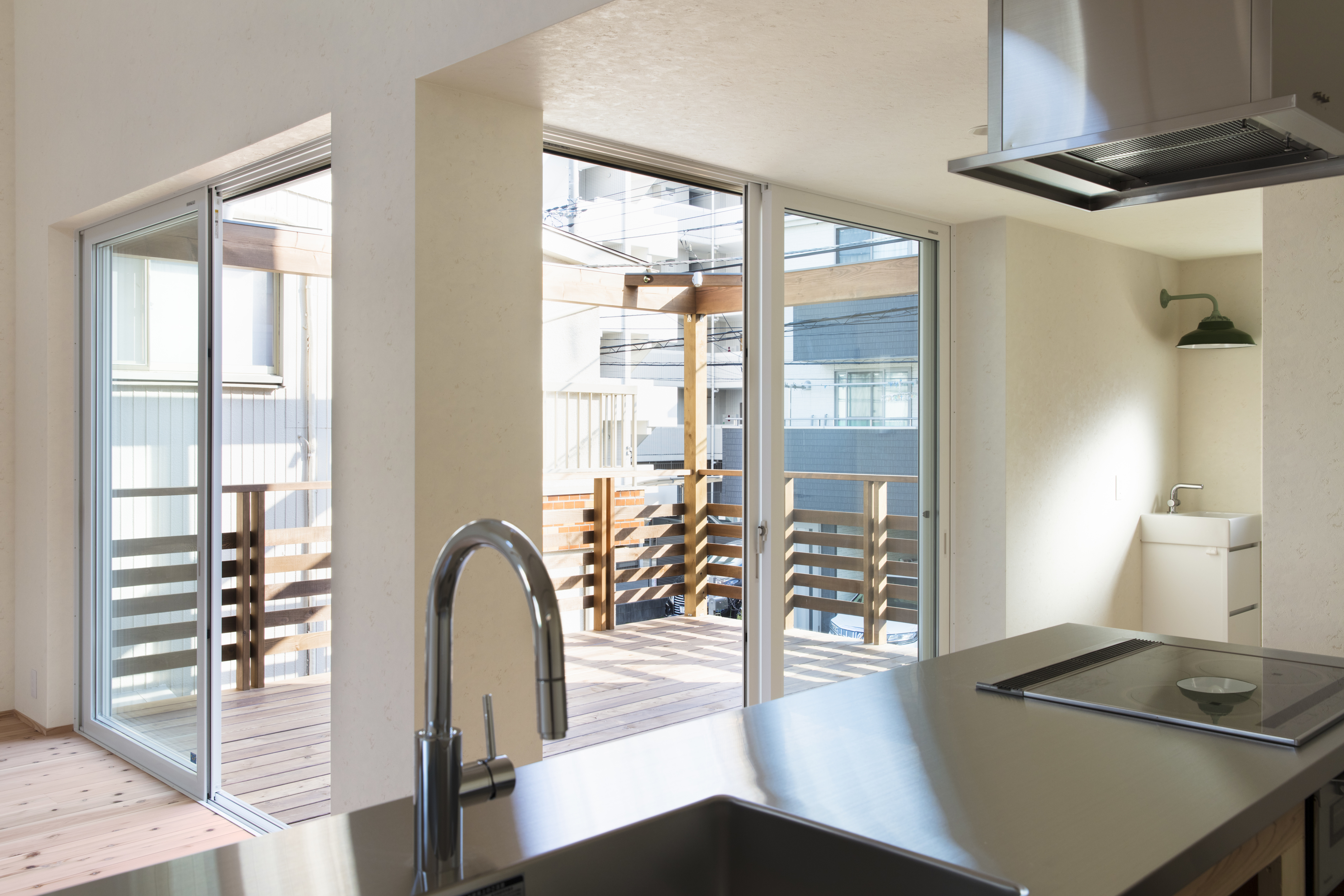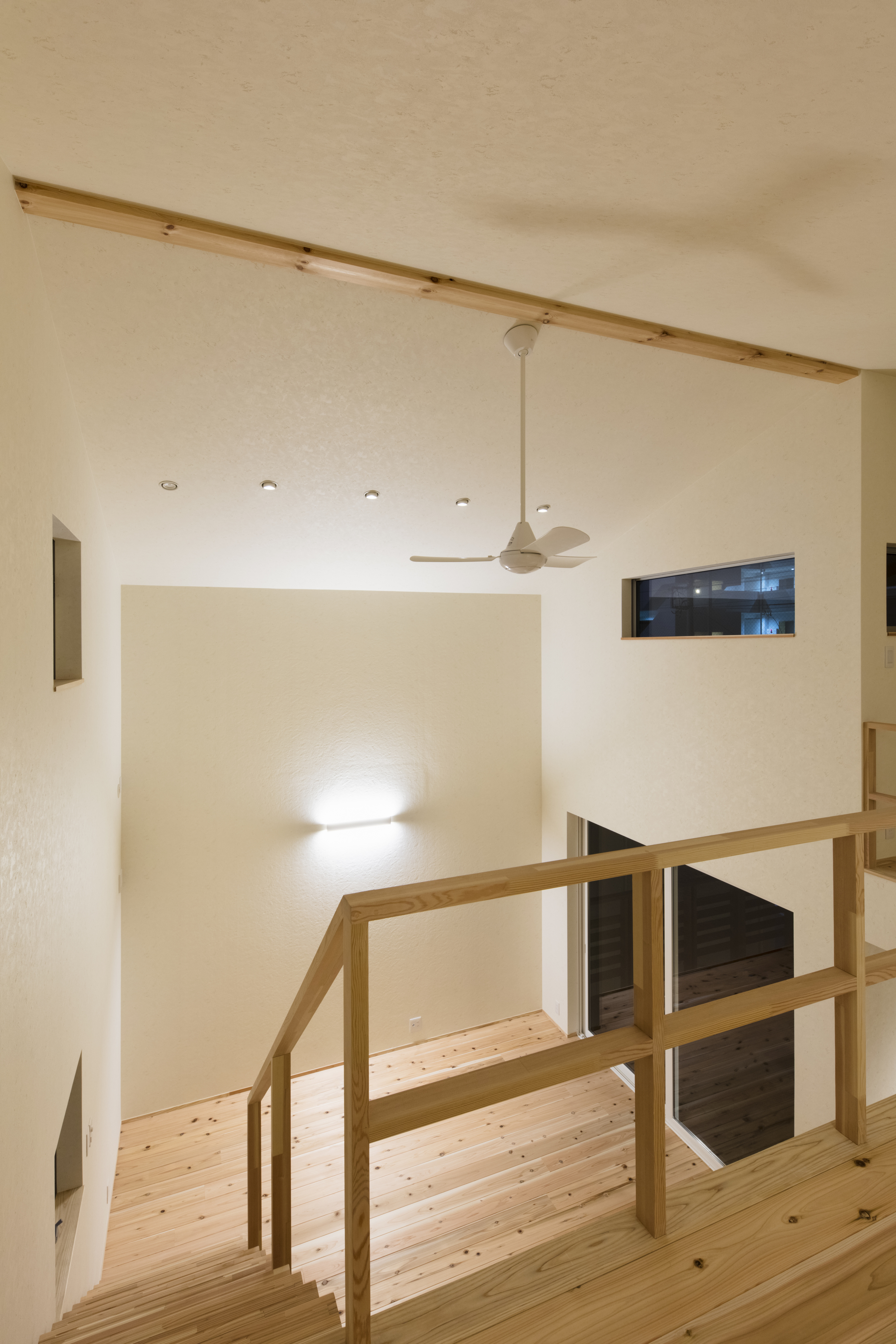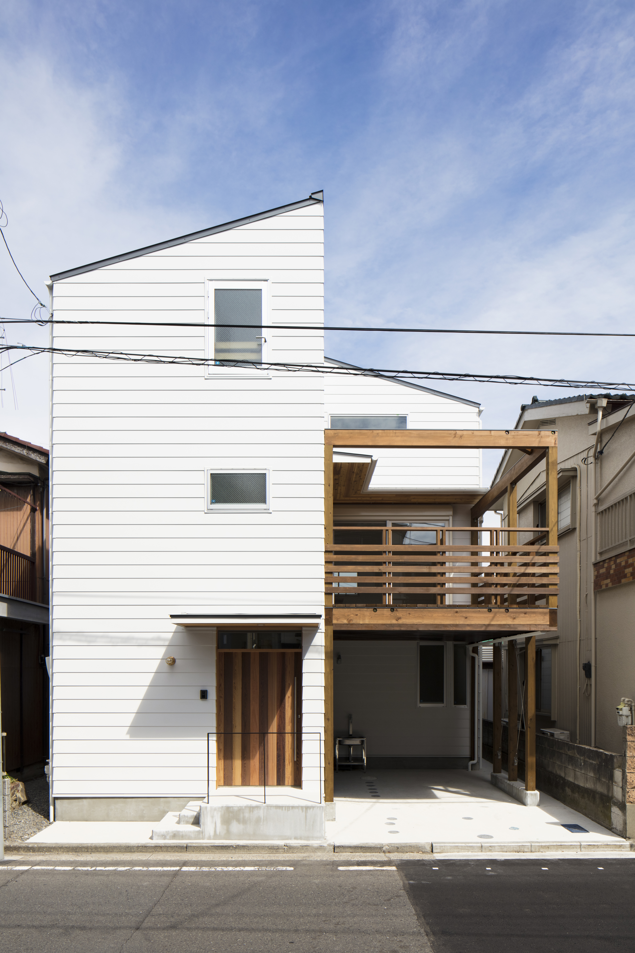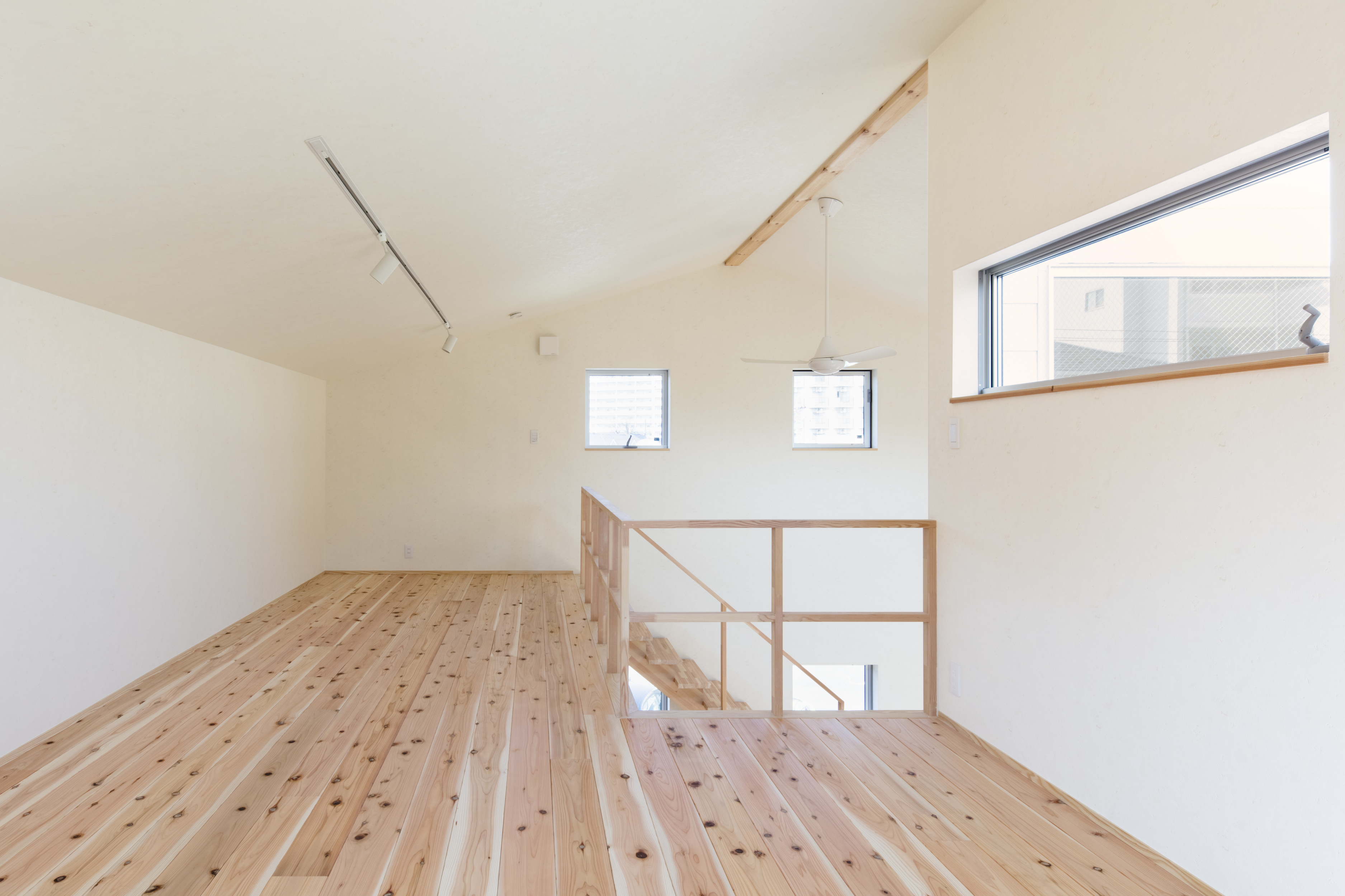 2階にある大きなバルコニーテラスとリビングダイニング。リビングから3階フリースペースへオープン階段でつながっていきます。 階段も家具の一つ、座って話をしたりするシーンも想像ができます。大きな左右対称の切妻屋根が特徴の室内空間は伸び伸び明るい印象 です。全般に杉の無垢床ではだしで歩いても気持ちが良く、色々なファブリックが映えそうです。 (PHOTO 澤崎信孝)